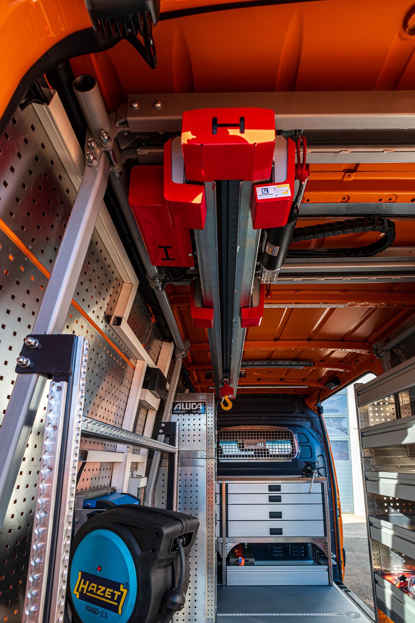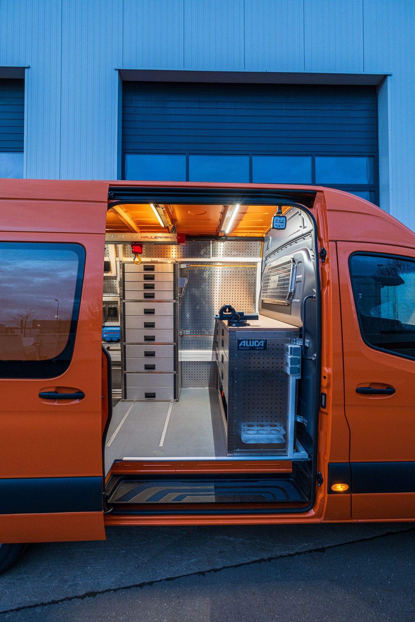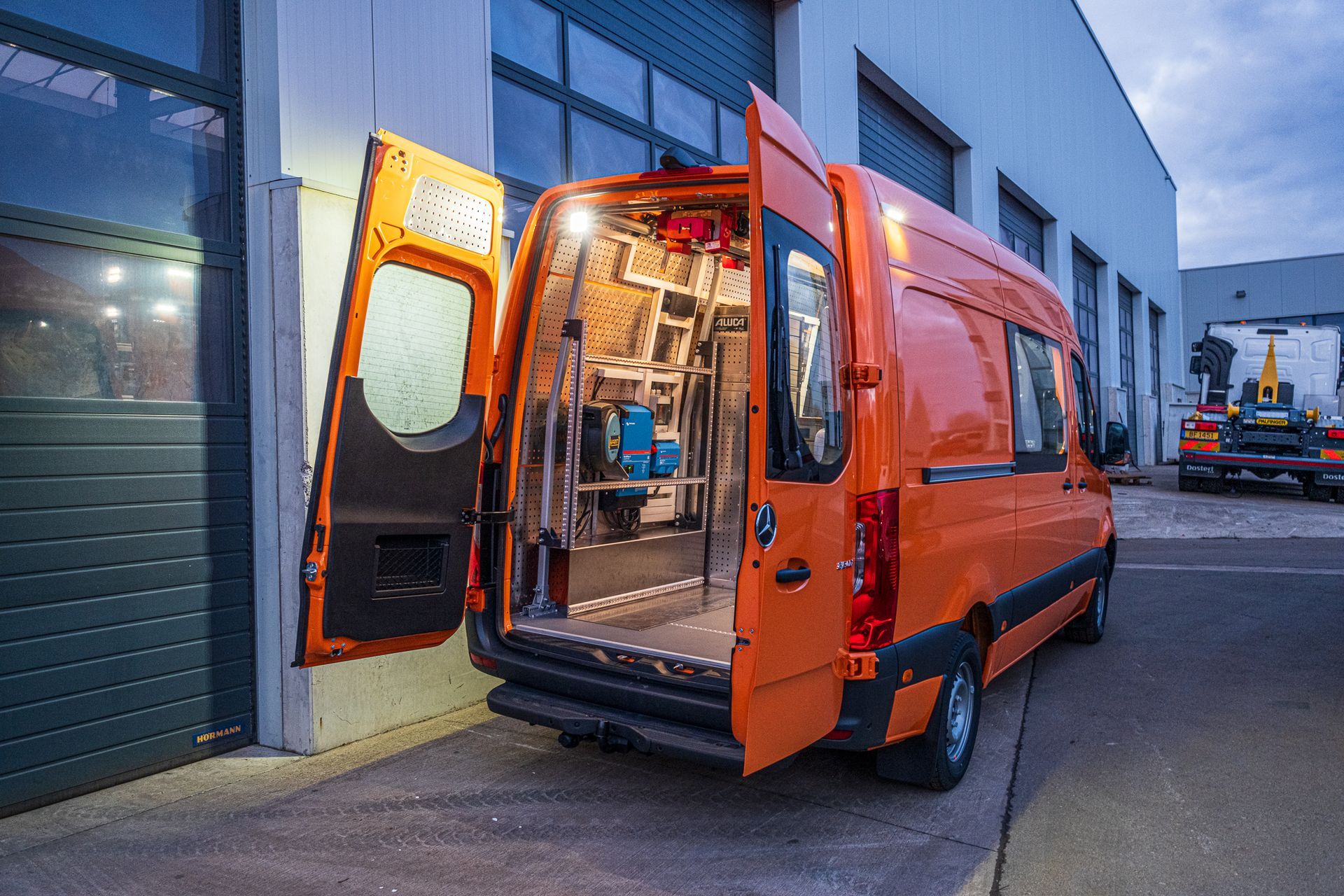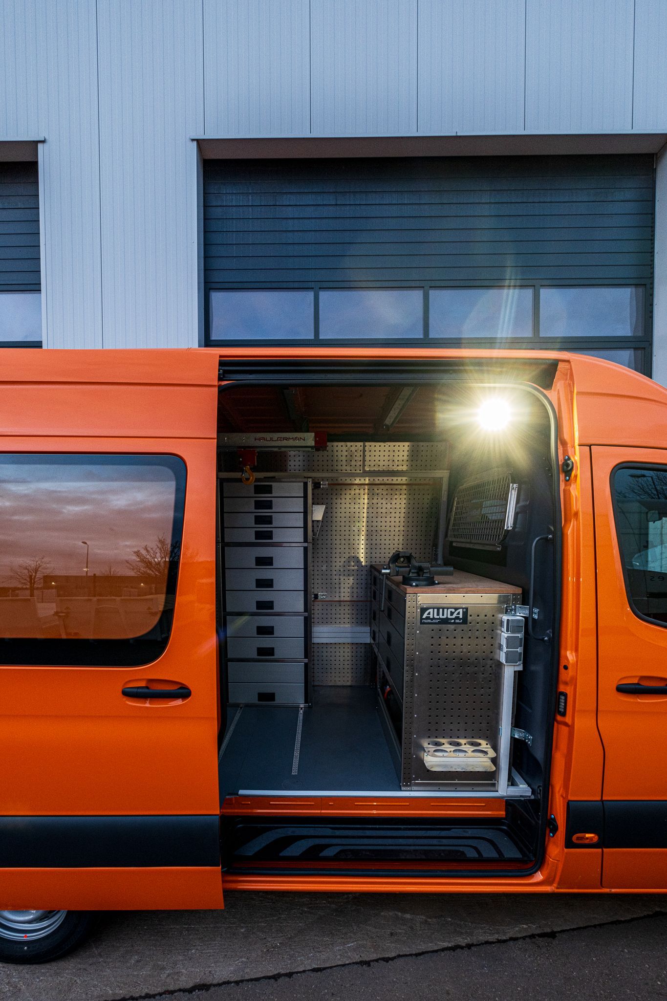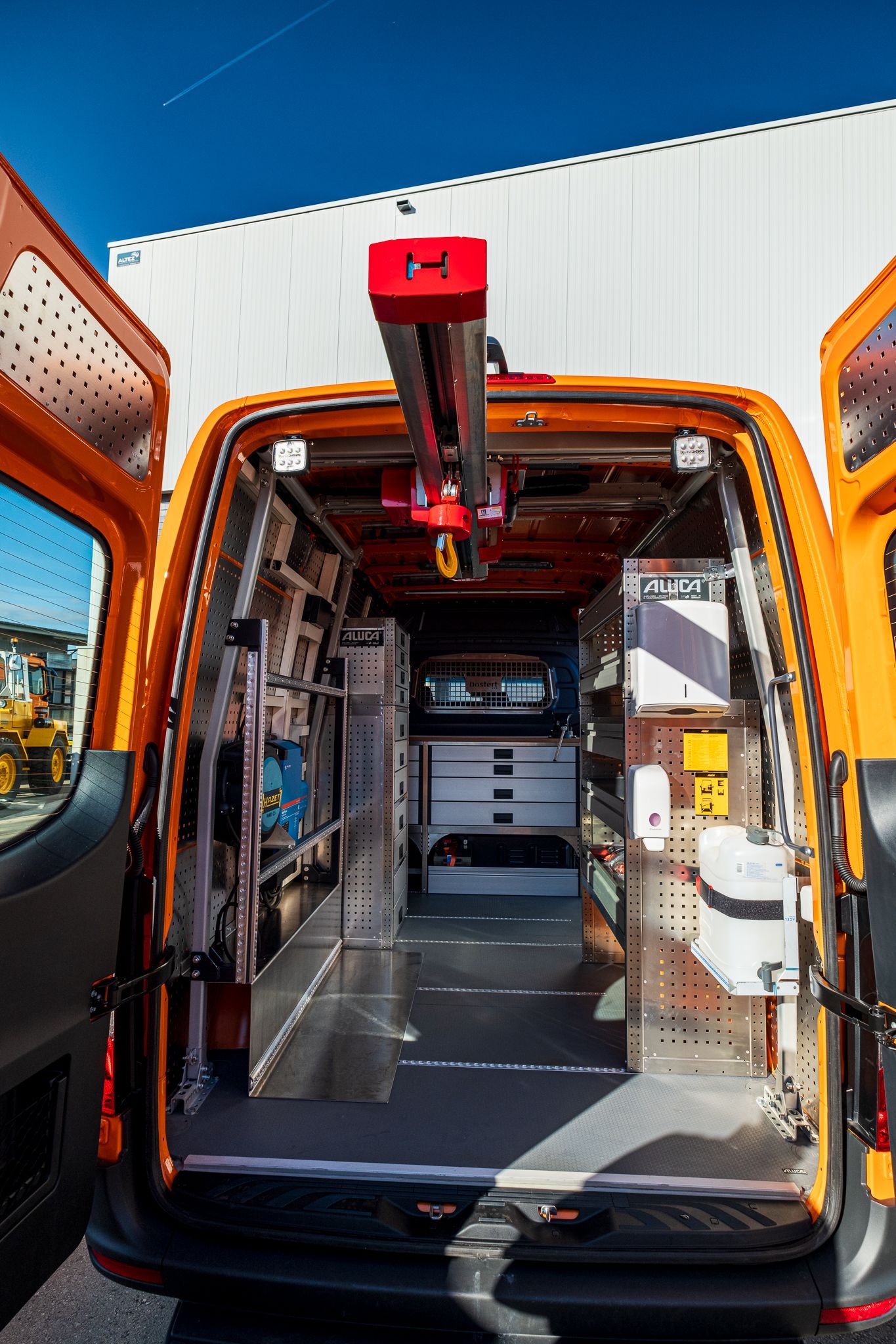 mit einem Haulerman Kran zum heben von Gewichten bis 250kg, inklusive Beleuchtung im Fahrzeug inneren sowie Umfeld Beleuchtung, montiert in einem Mercedes-Benz Sprinter