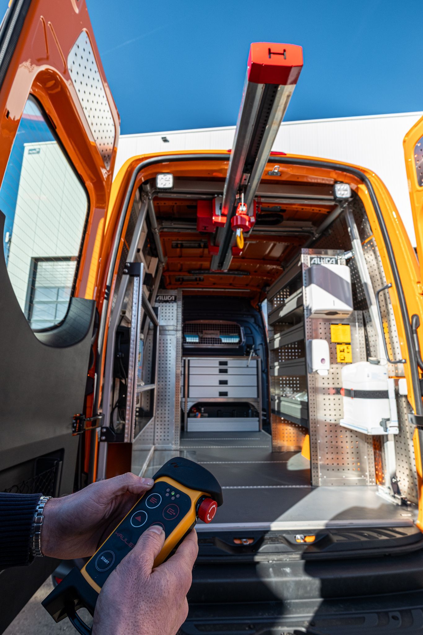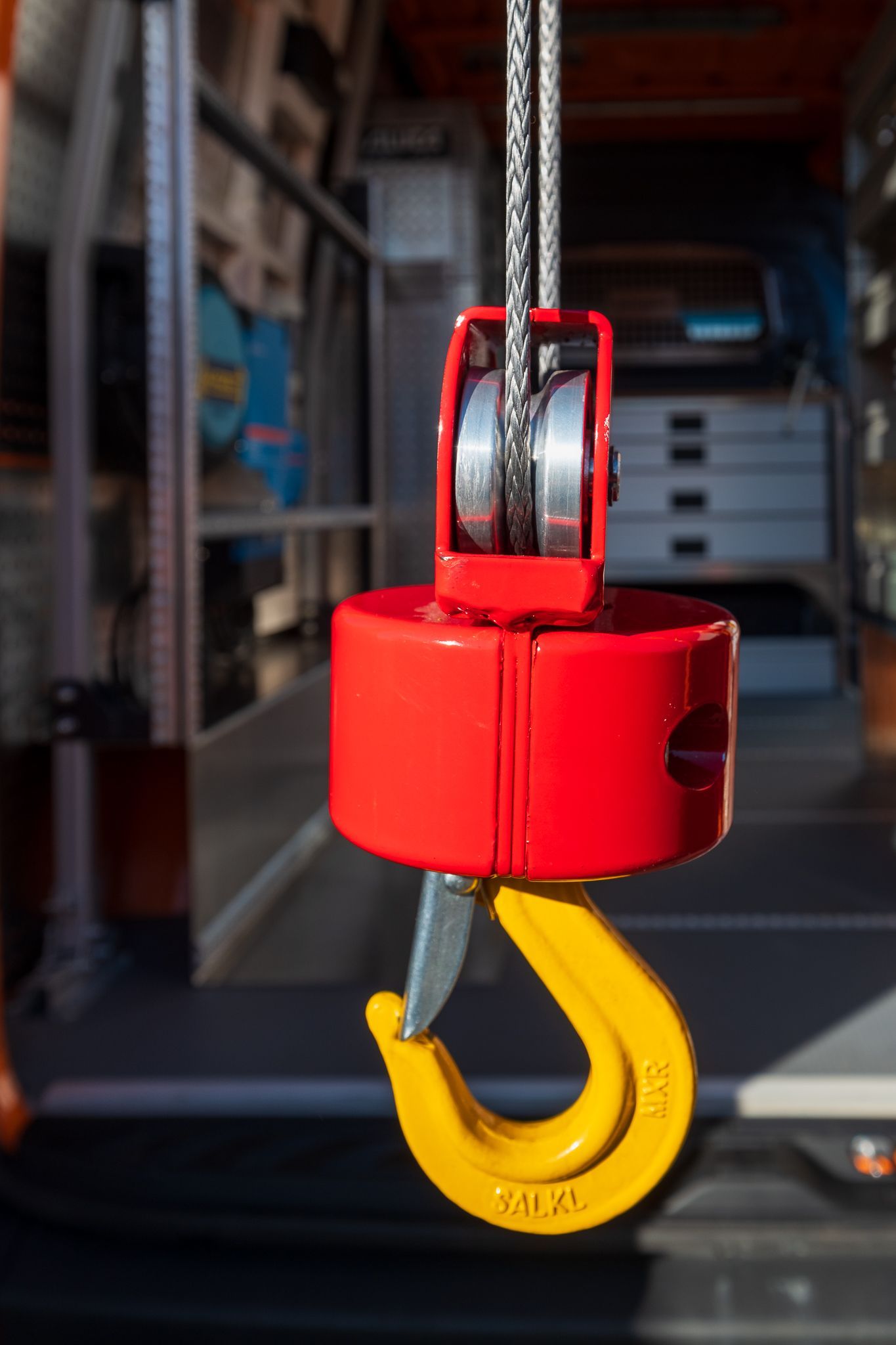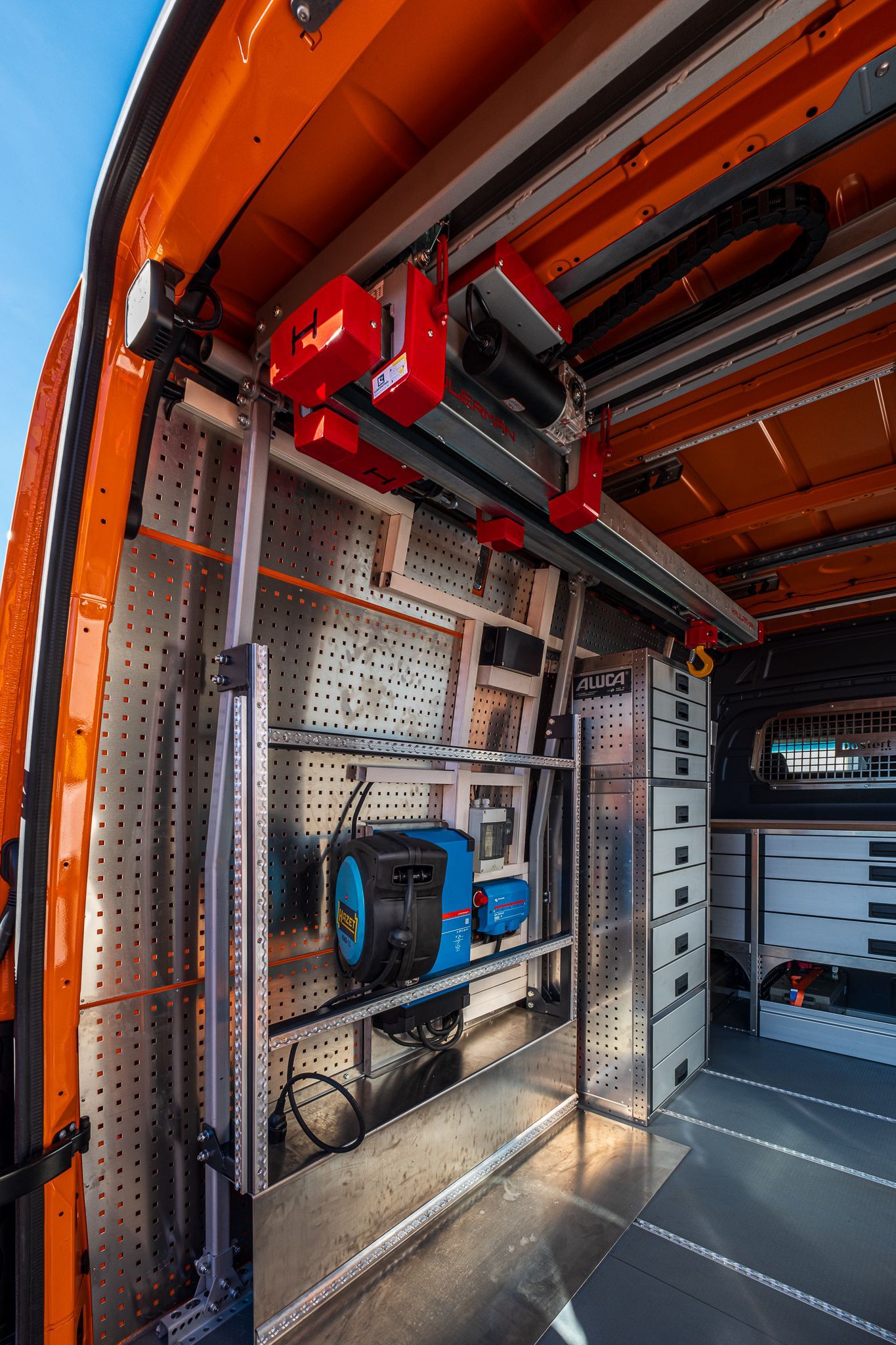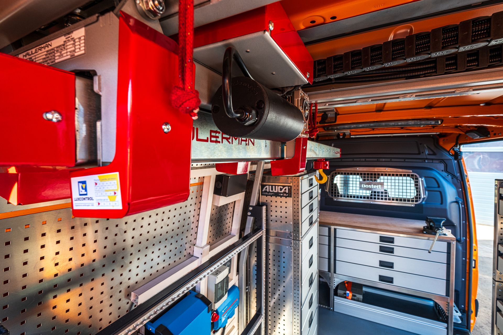 mit einem Haulerman Kran zum heben von Gewichten bis 250kg, inklusive Beleuchtung im Fahrzeug inneren sowie Umfeld Beleuchtung, montiert in einem Mercedes-Benz Sprinter
