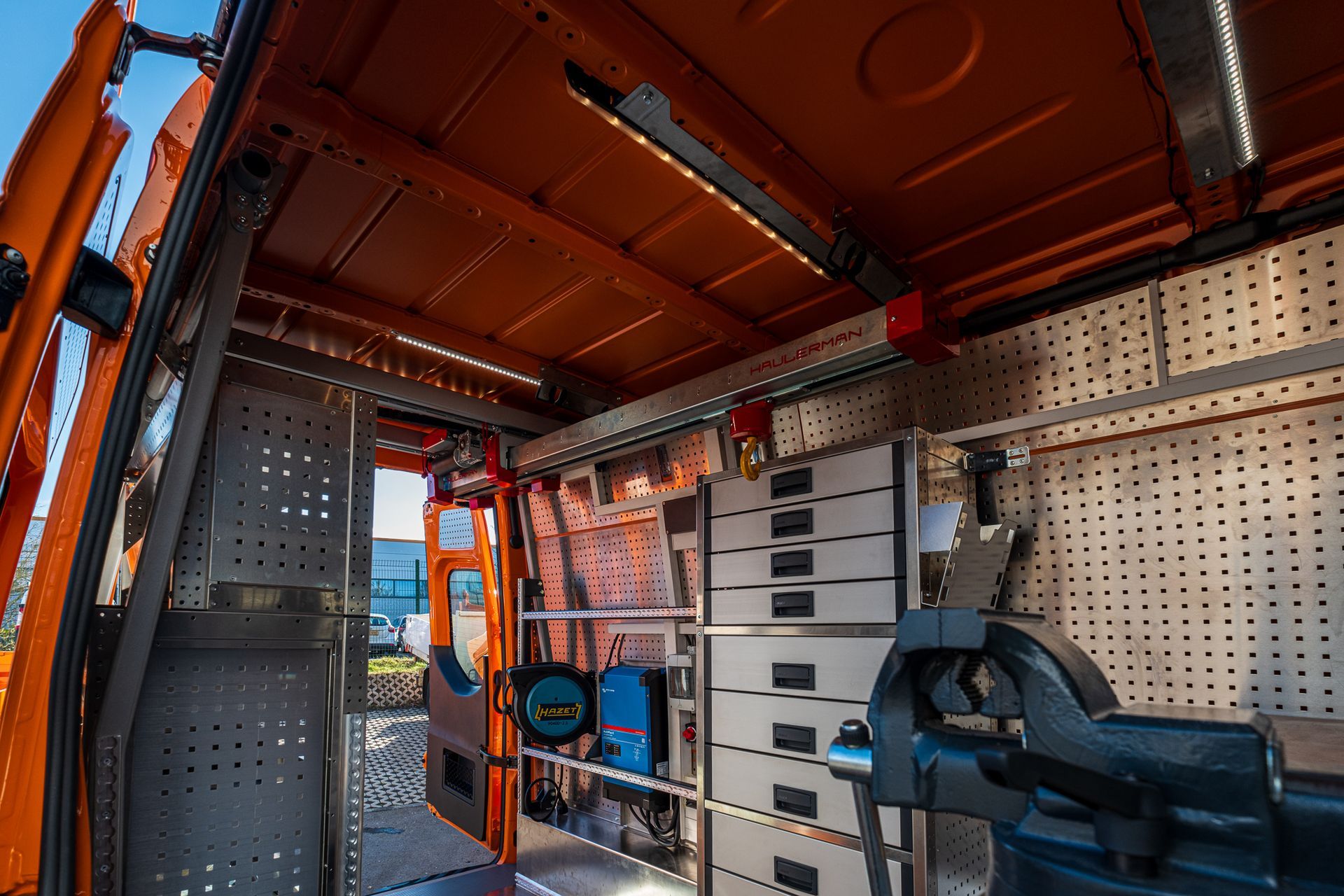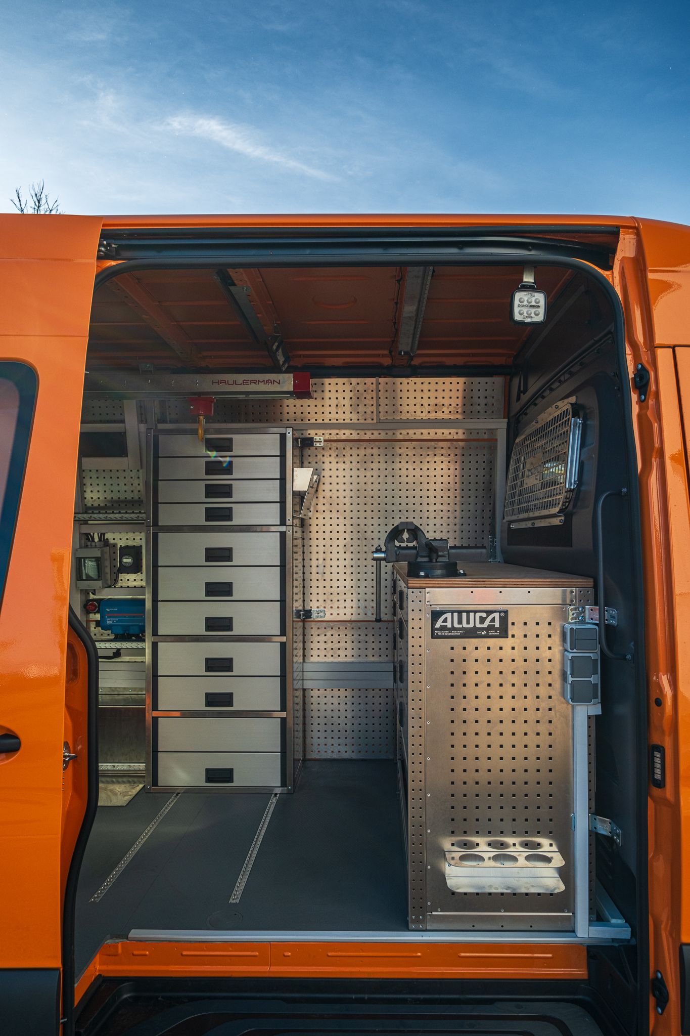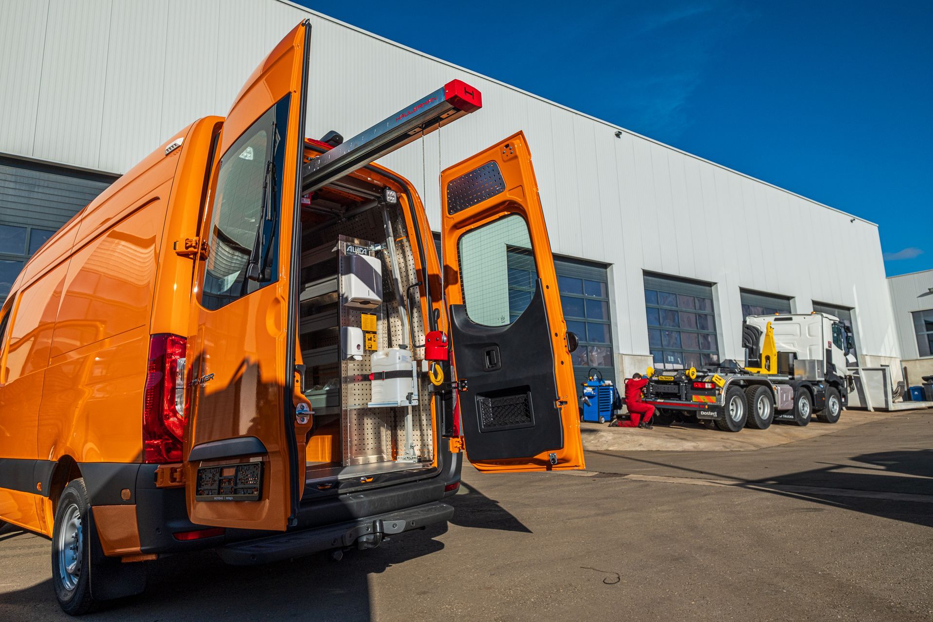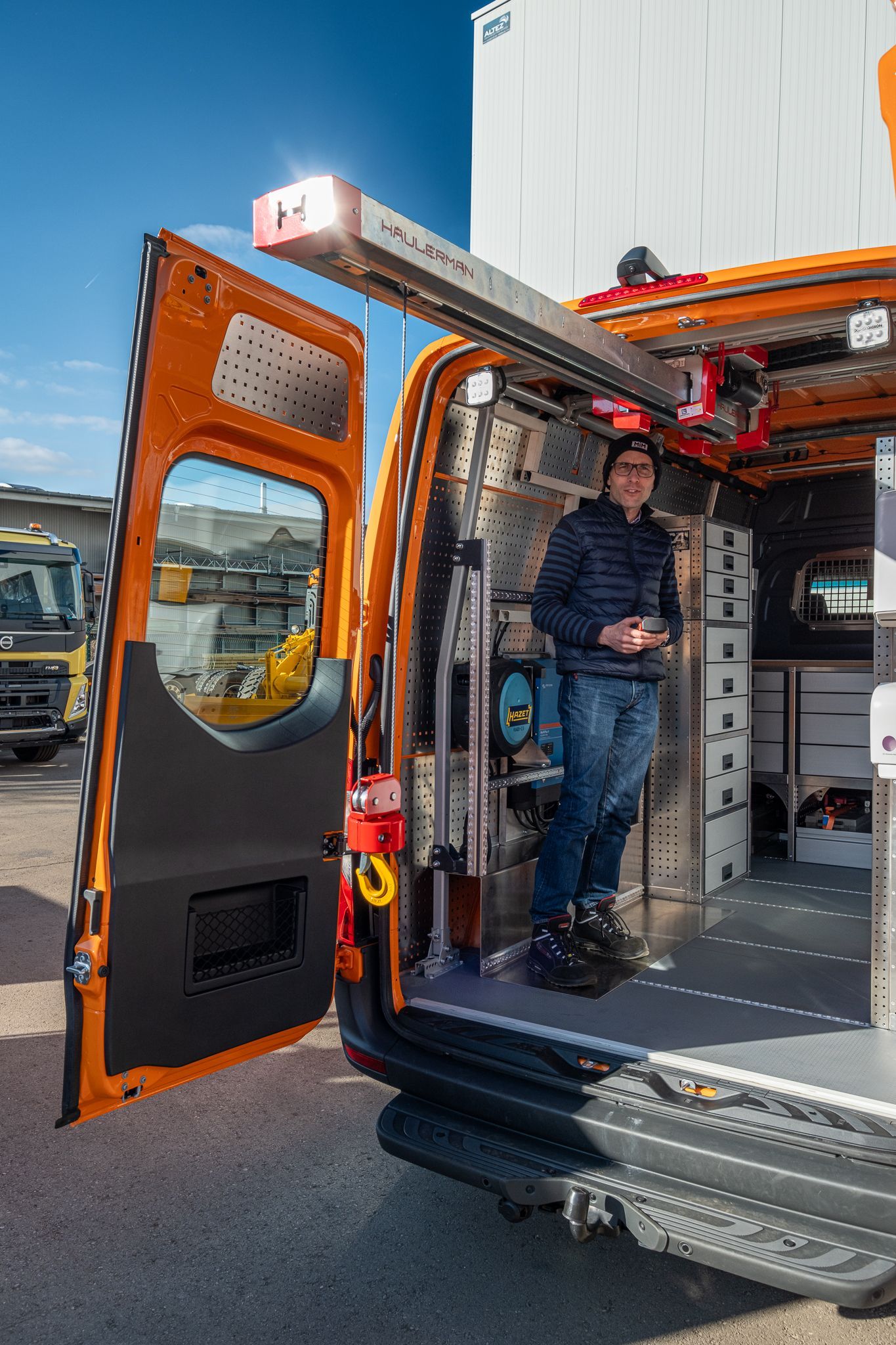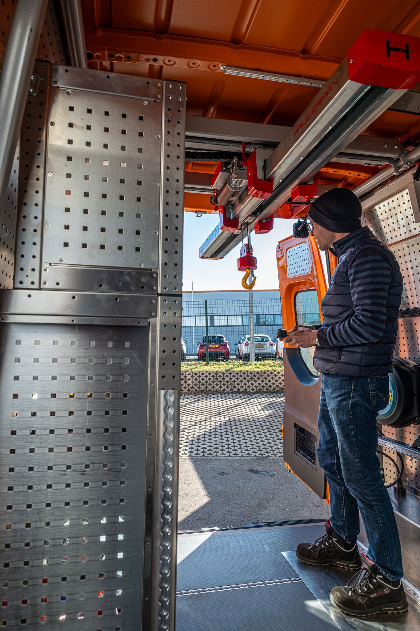 mit einem Haulerman Kran zum heben von Gewichten bis 250kg, inklusive Beleuchtung im Fahrzeug inneren sowie Umfeld Beleuchtung, montiert in einem Mercedes-Benz Sprinter