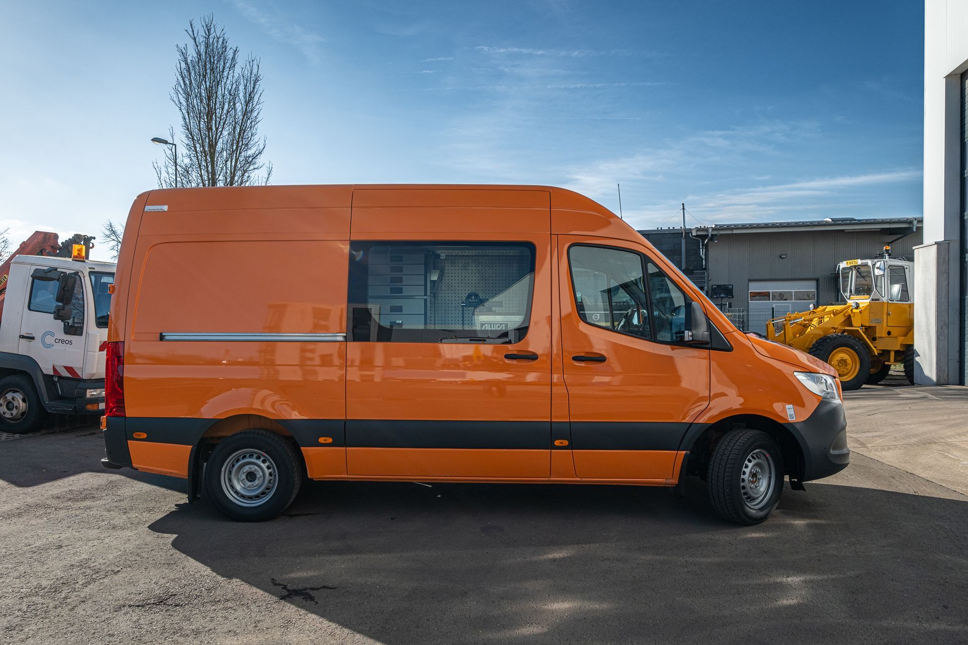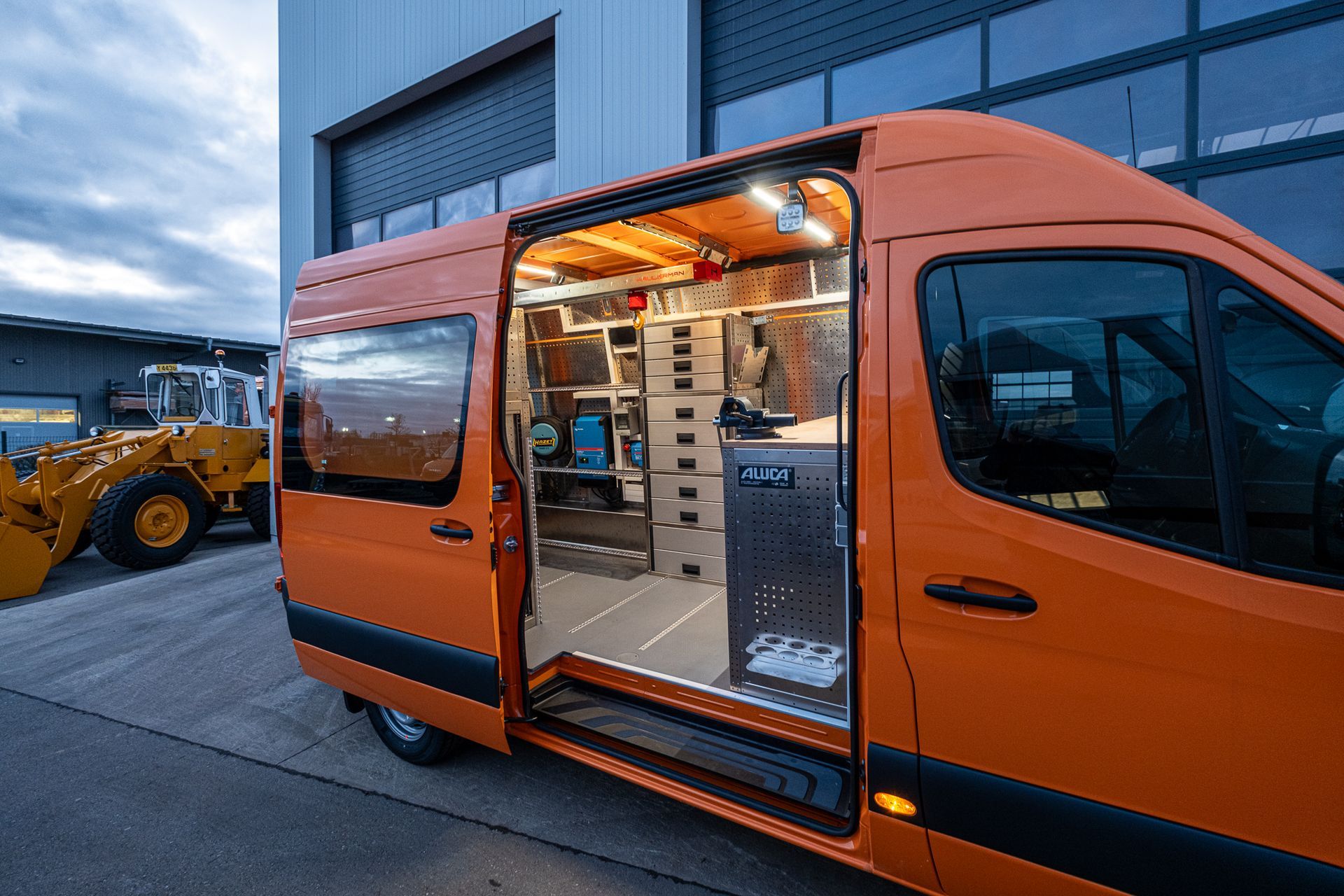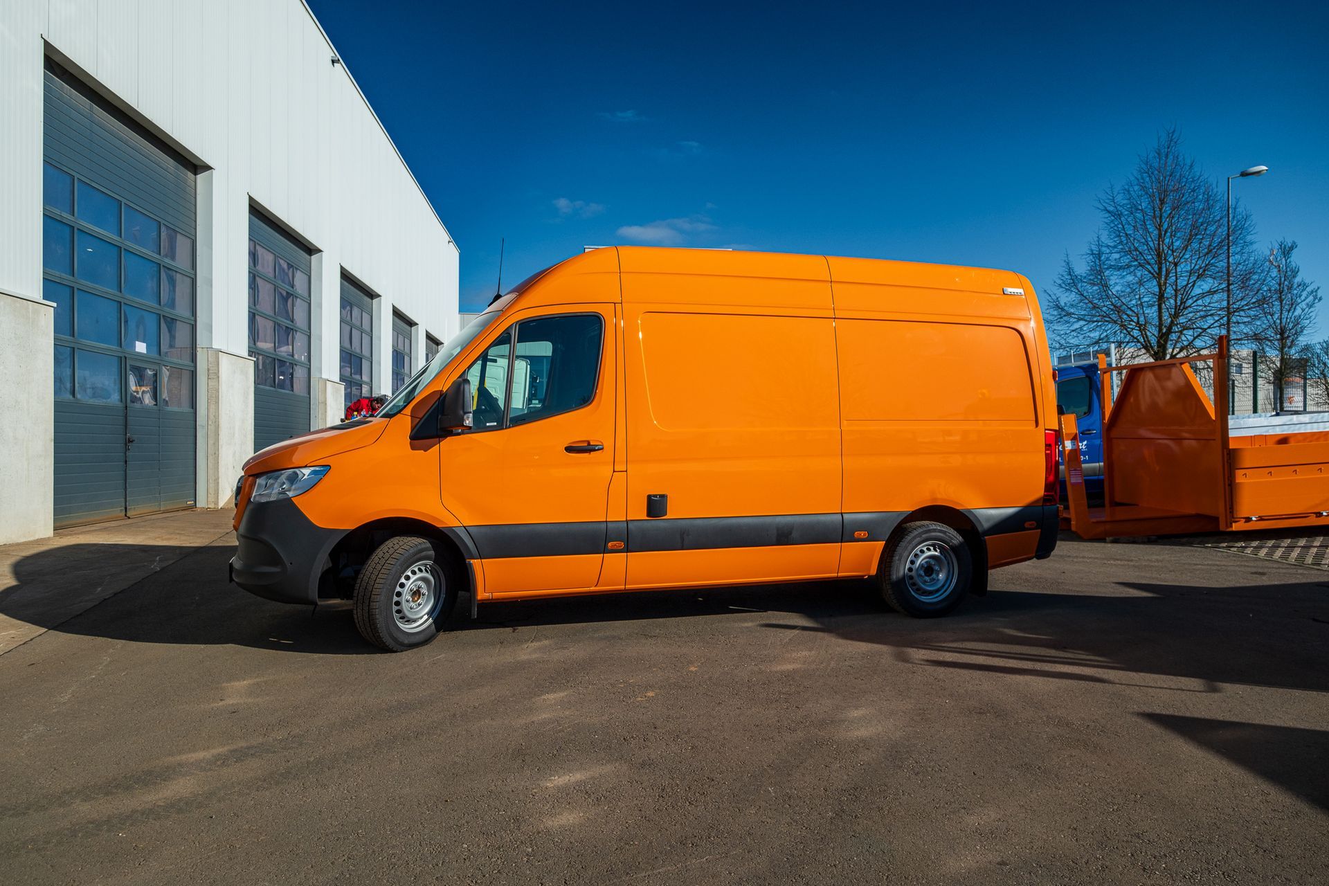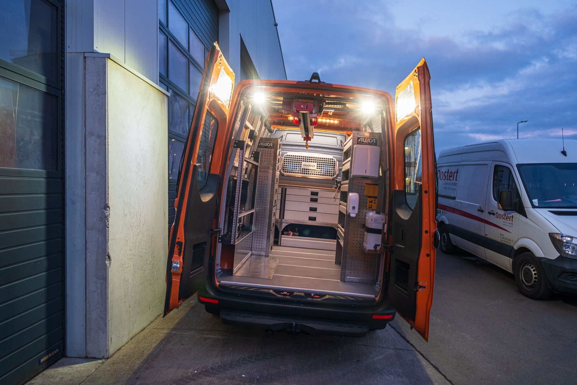 mit einem Haulerman Kran zum heben von Gewichten bis 250kg, inklusive Beleuchtung im Fahrzeug inneren sowie Umfeld Beleuchtung, montiert in einem Mercedes-Benz Sprinter