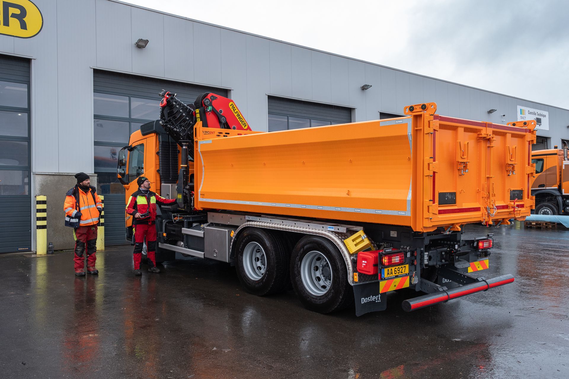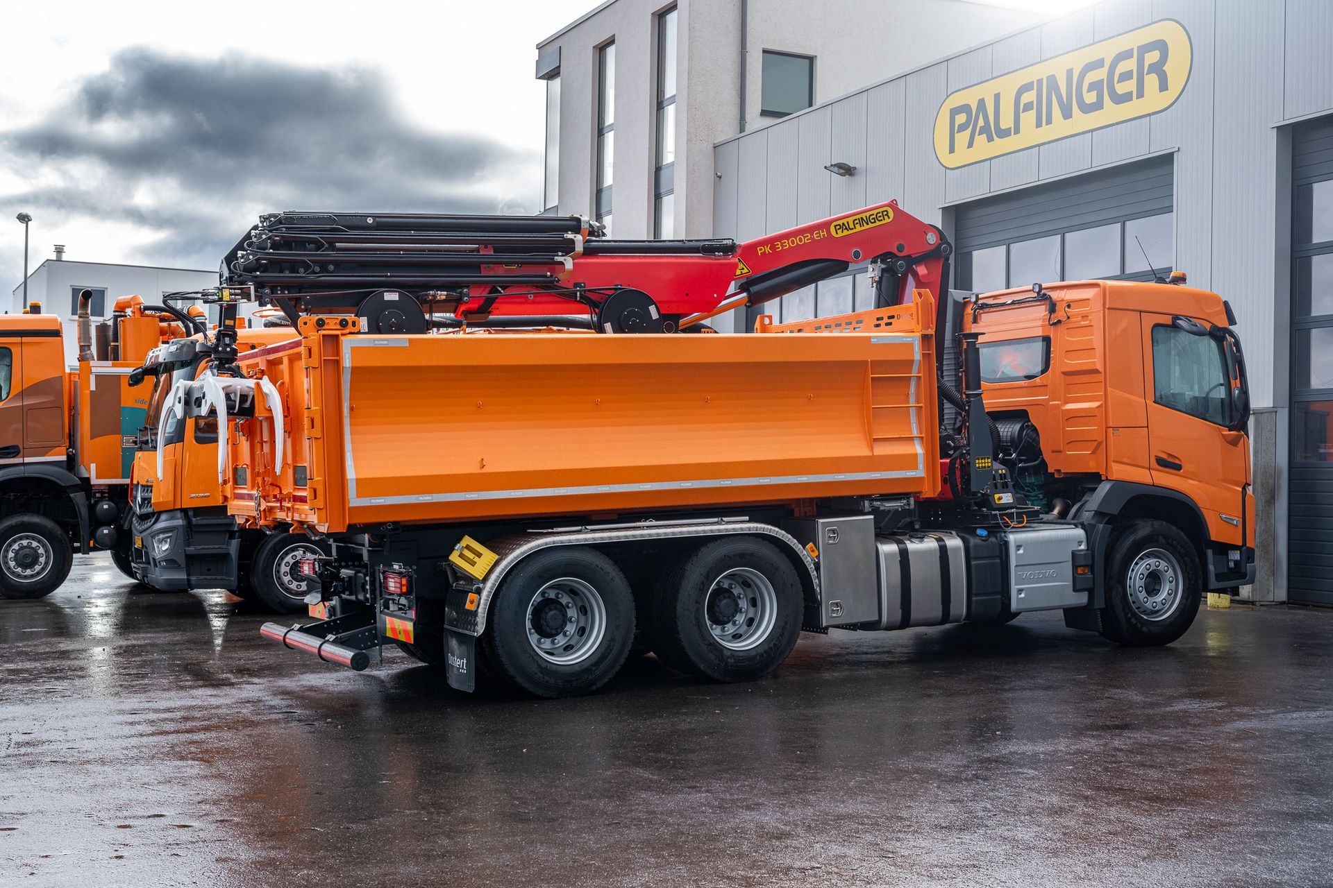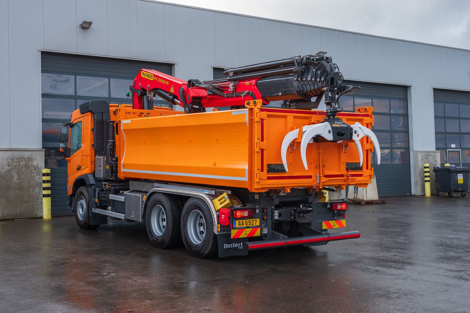 Palfinger Kran PK 33002-EH mit einem Carrosserie Vincent Heckkipper montiert auf einem Volvo 3-achs Fahrgestell