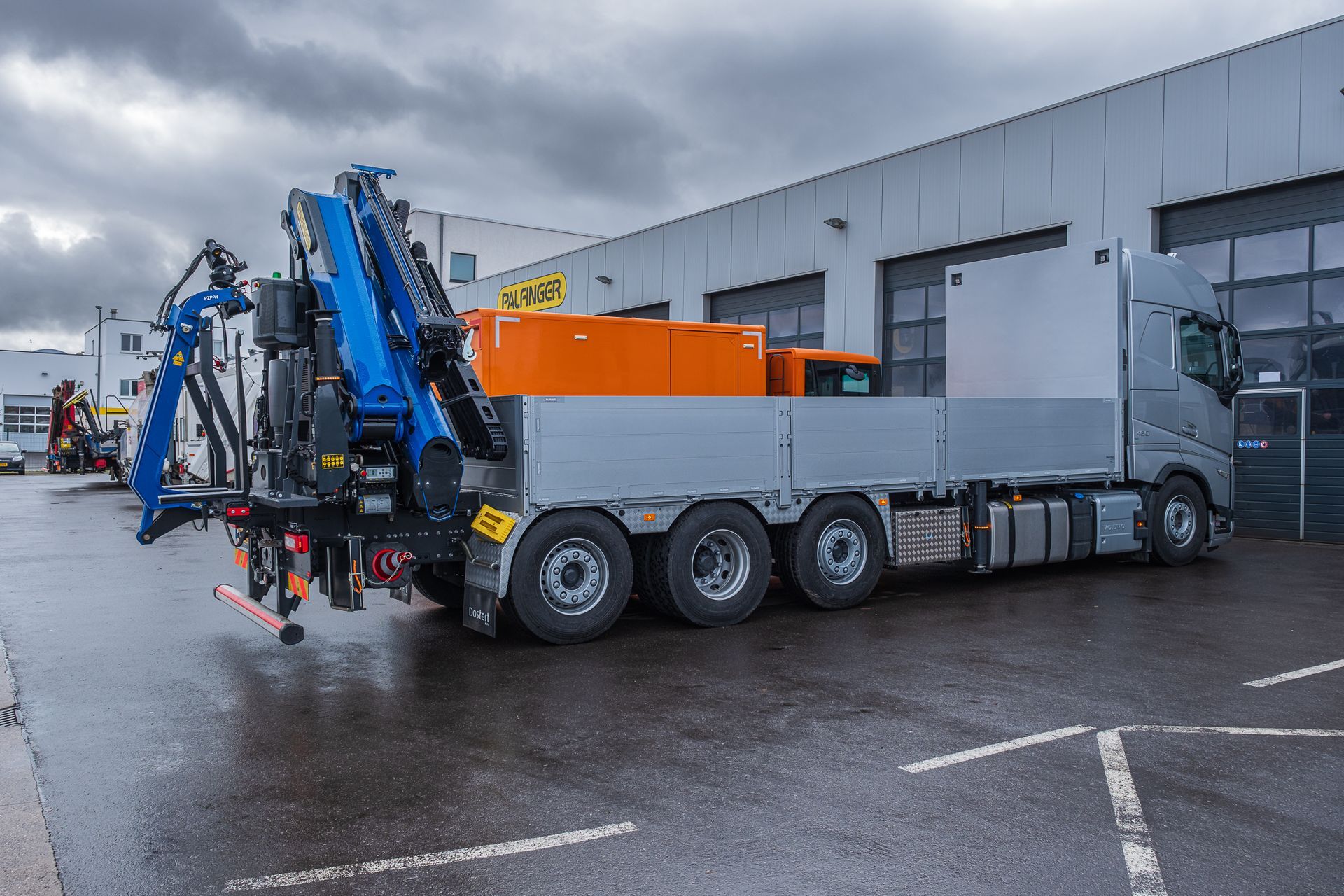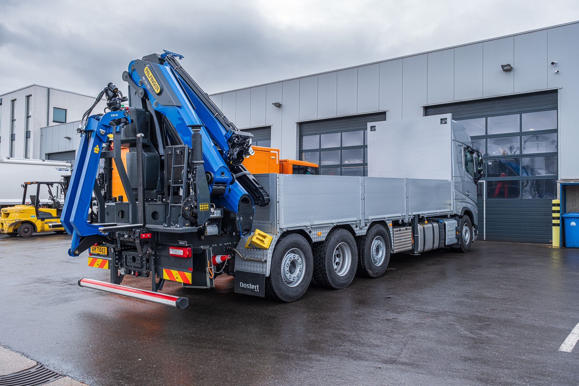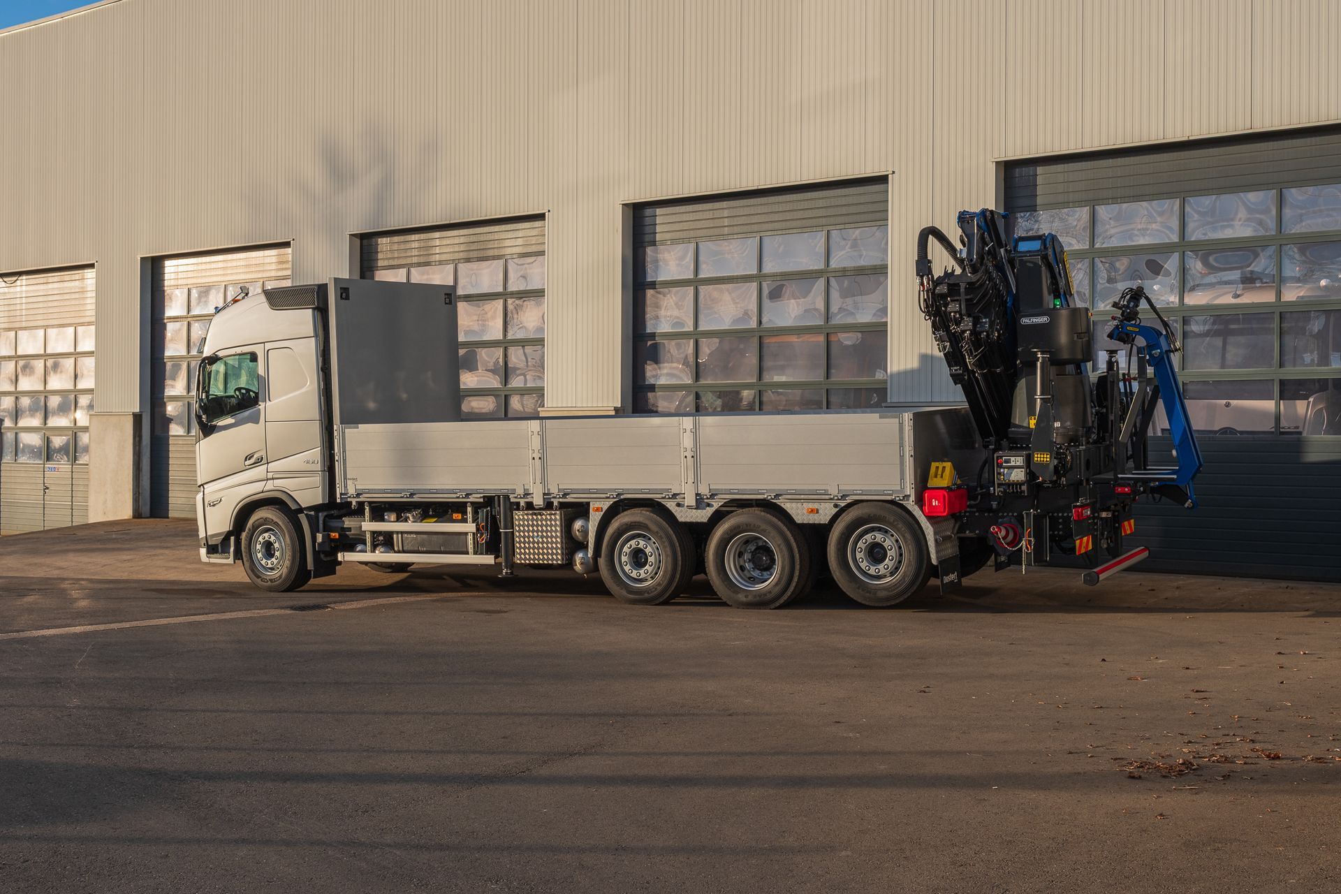 Palfinger Kran PK 370 ZEC F & PJ 075 A mit einer Pritsche montiert auf einem Volvo 4-achs Fahrgestell
