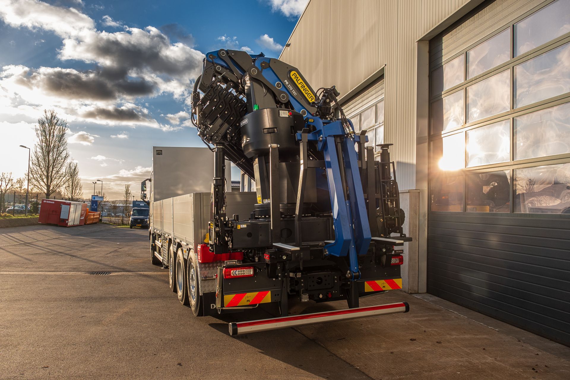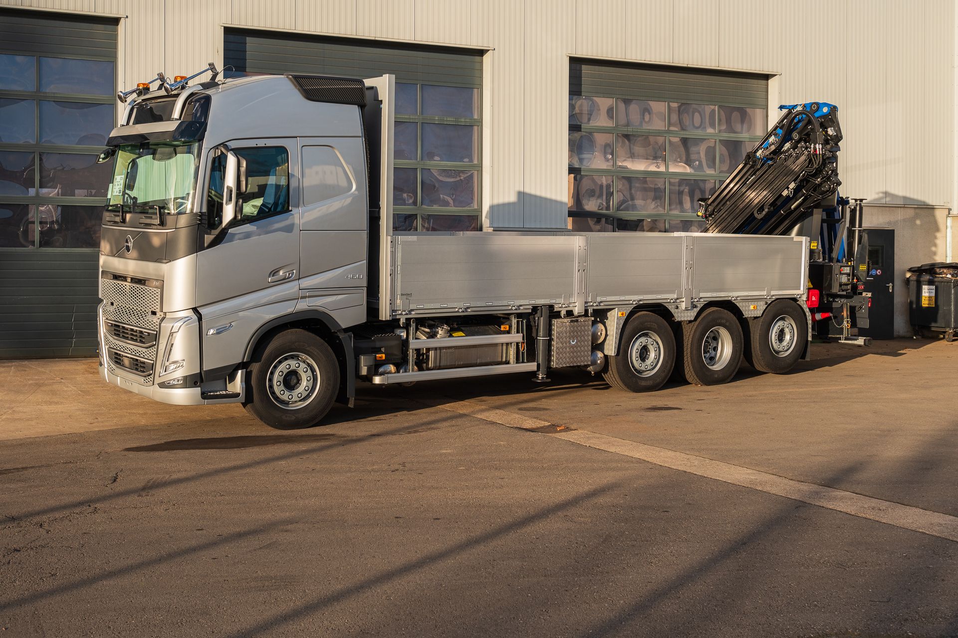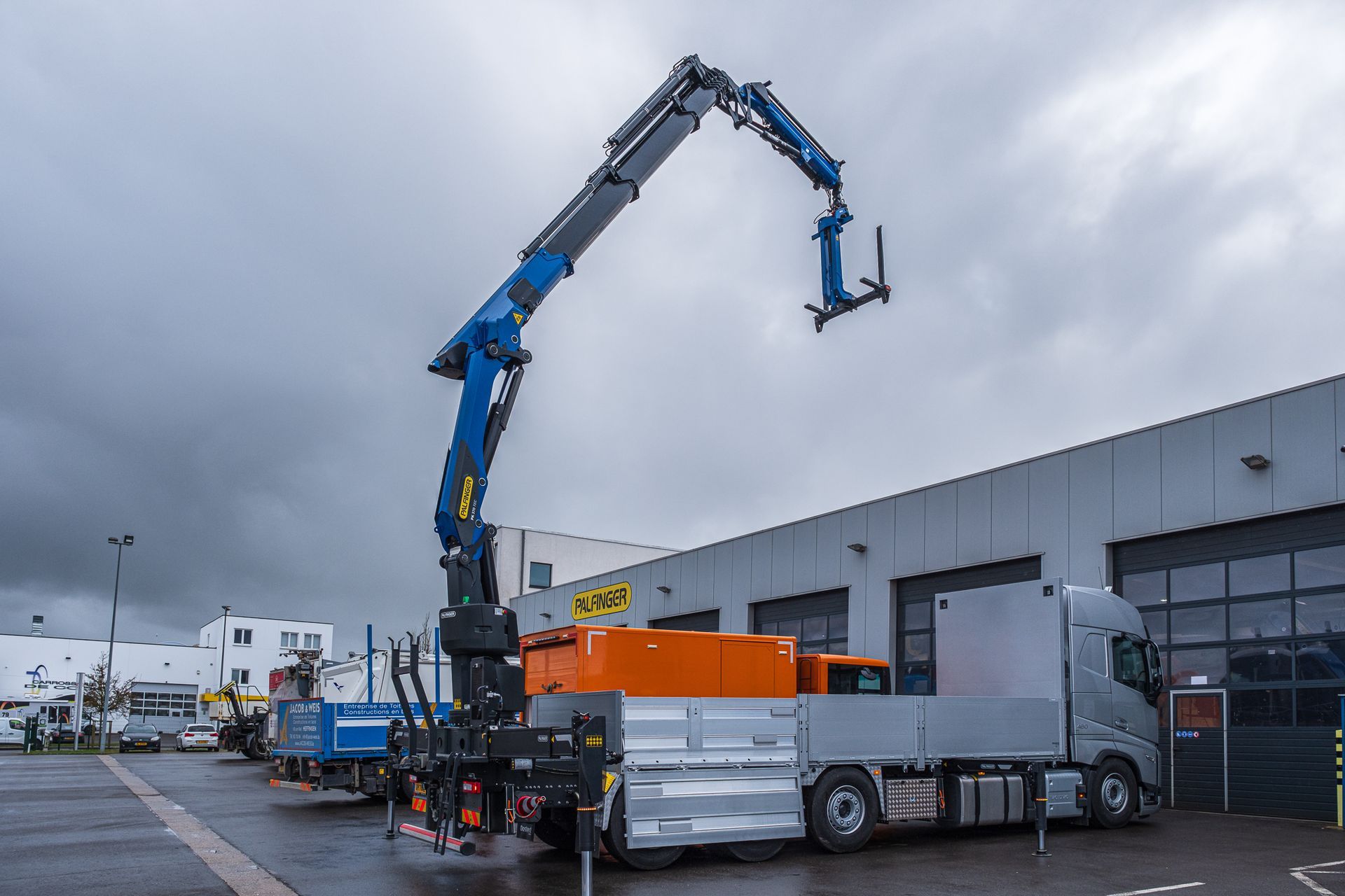 Palfinger Kran PK 370 ZEC F & PJ 075 A mit einer Pritsche montiert auf einem Volvo 4-achs Fahrgestell