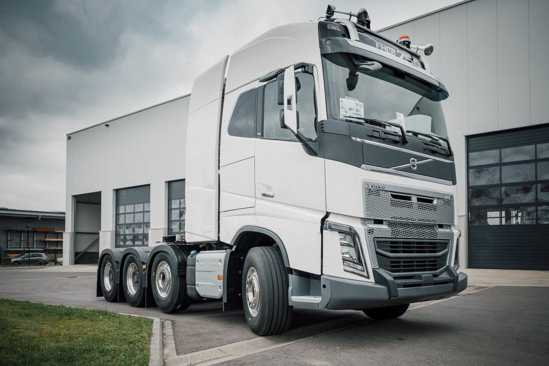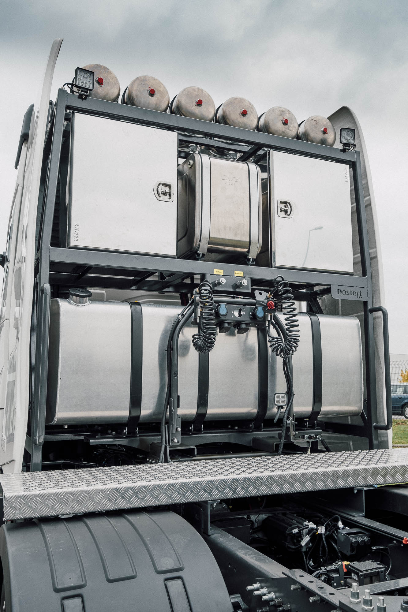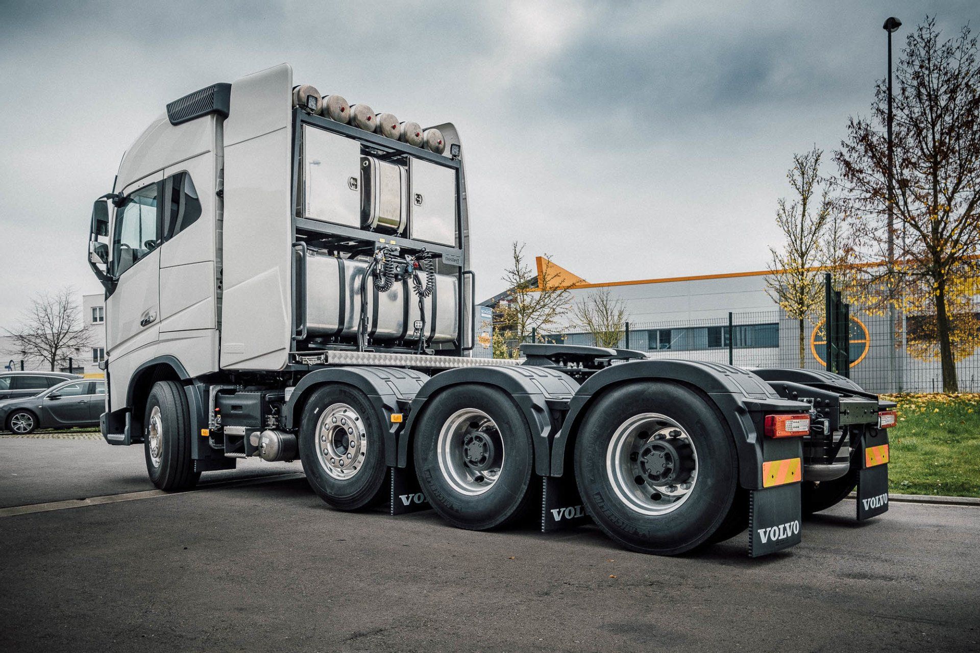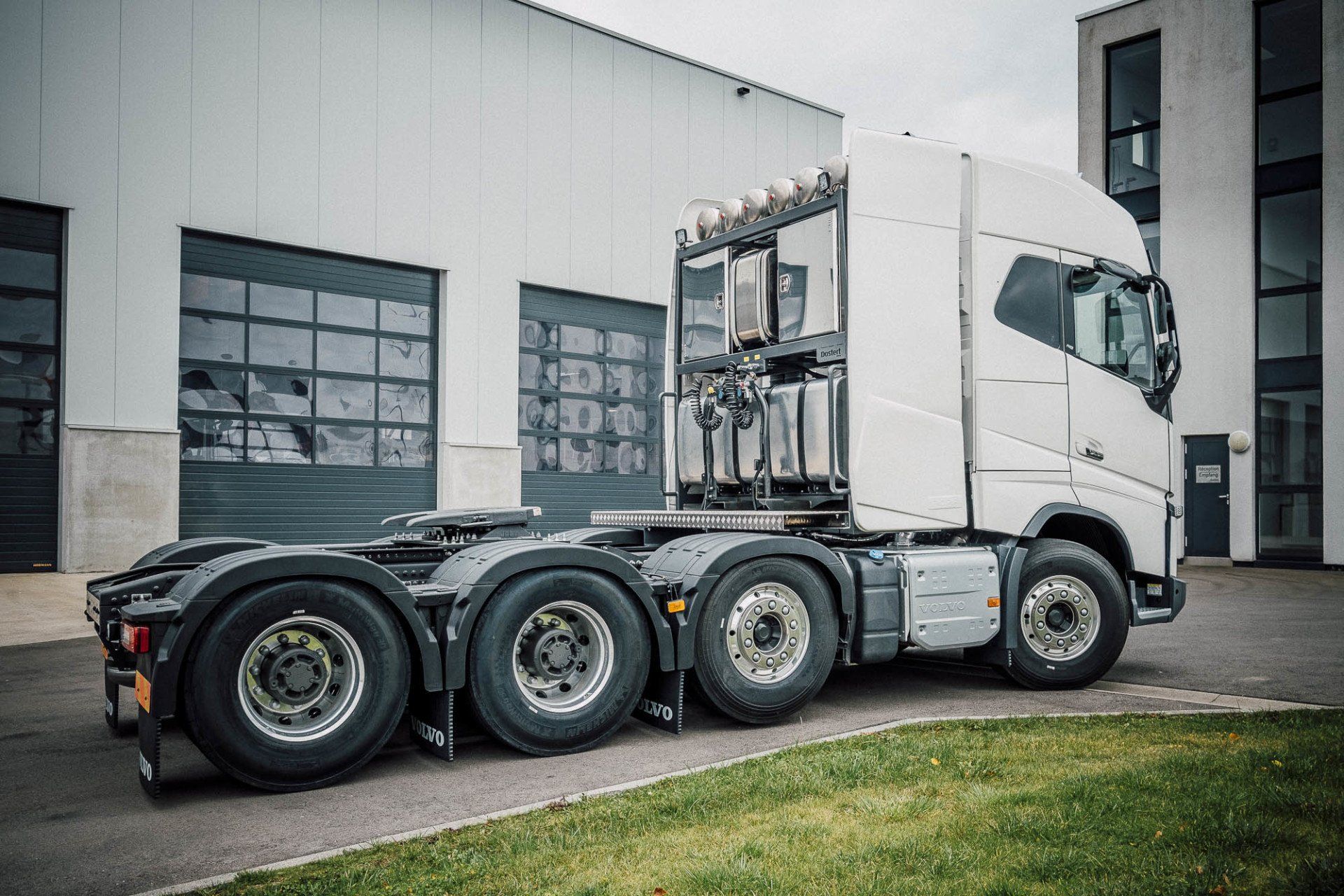 Aufbau eines Schwerlasturmes und Seitenverkleidung, mit Hydraulik für Anhänger an einem Volvo FH16