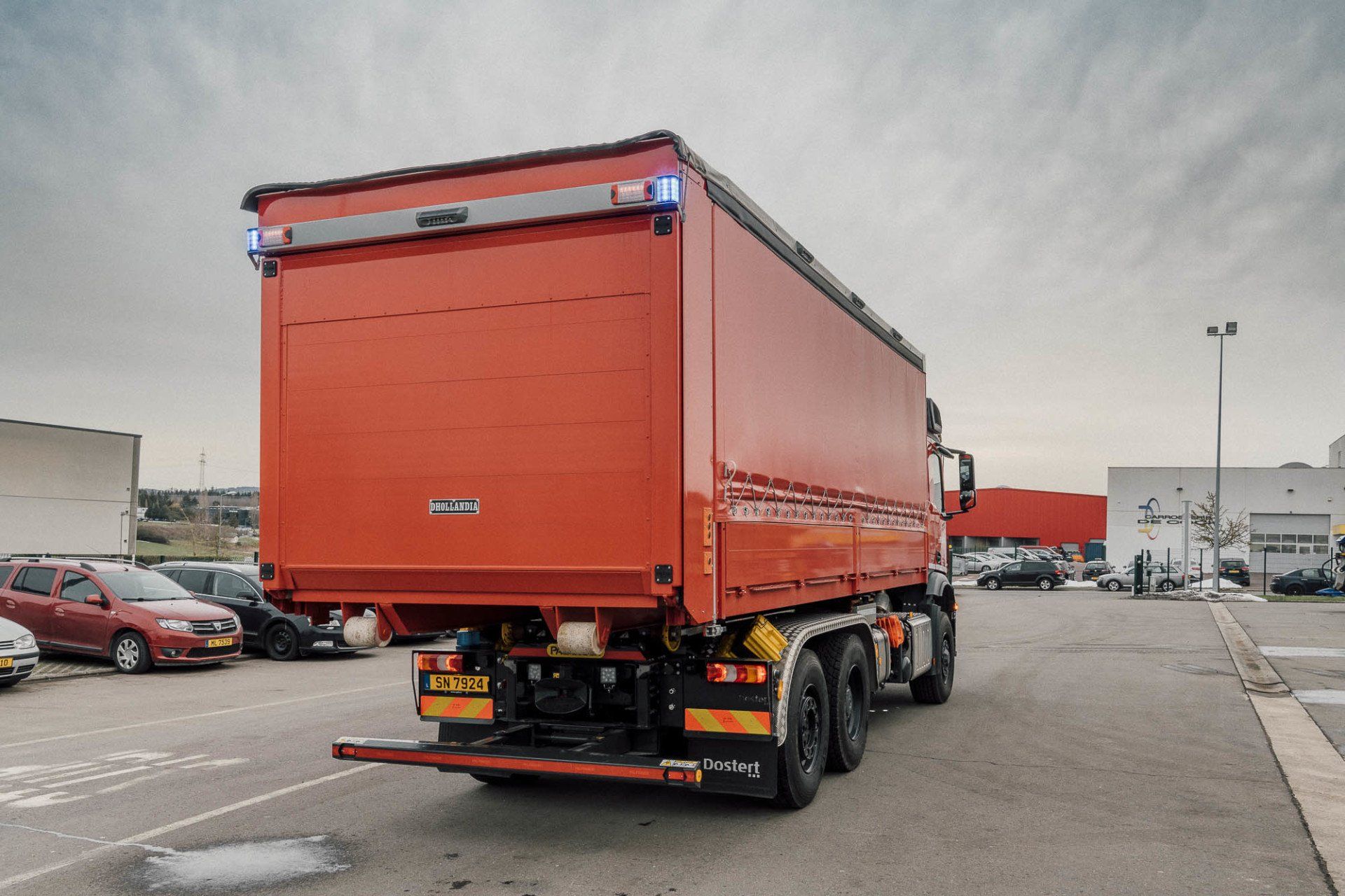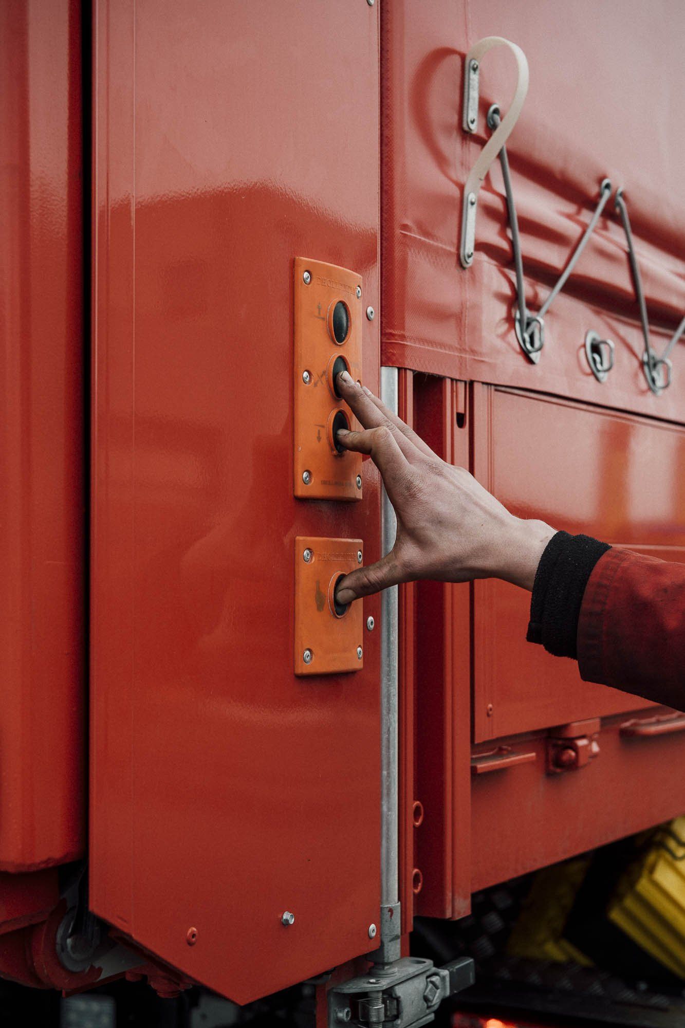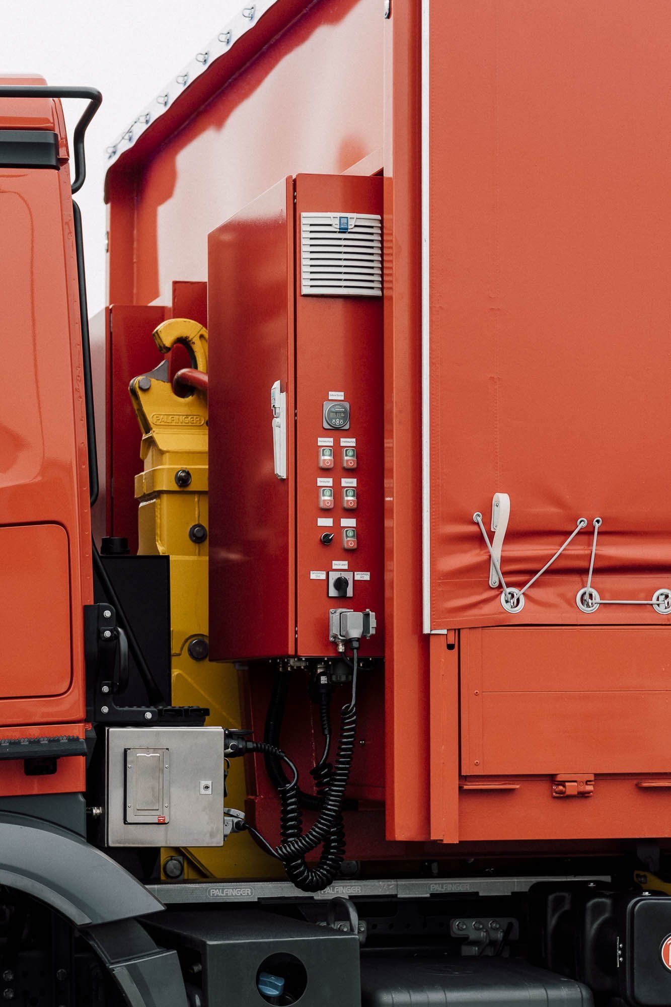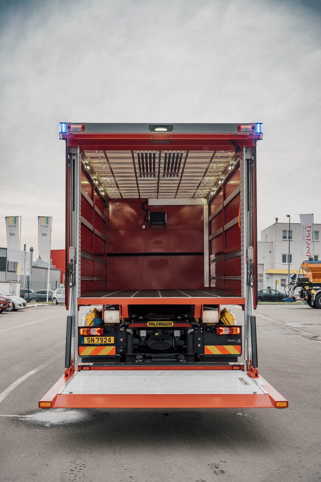 Container von unserem Lieferanten REALMET,mit Vertiakllift und Umfeldbeleuchtung und Innenbeleuchtung. Steuerung vom Vertikallift über Fusstaster und Aussensteuerung. Sperrbalken zur Sicherung der Rollcontainer.
