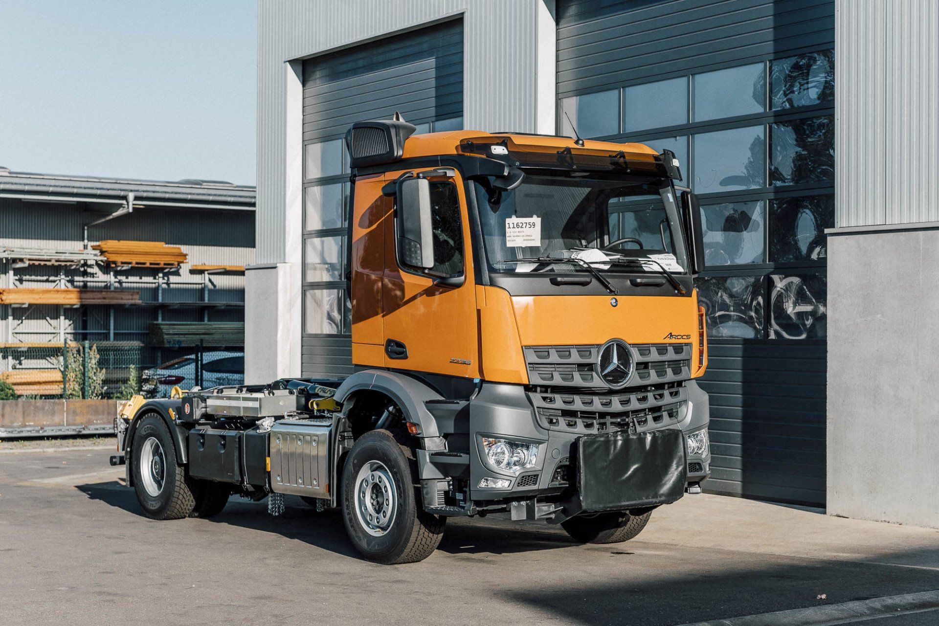 montiert auf einem 2-achs Mercedes-Benz Arocs Fahrgestell, mit Winterdiensthydraulik und Schneepflugplatte