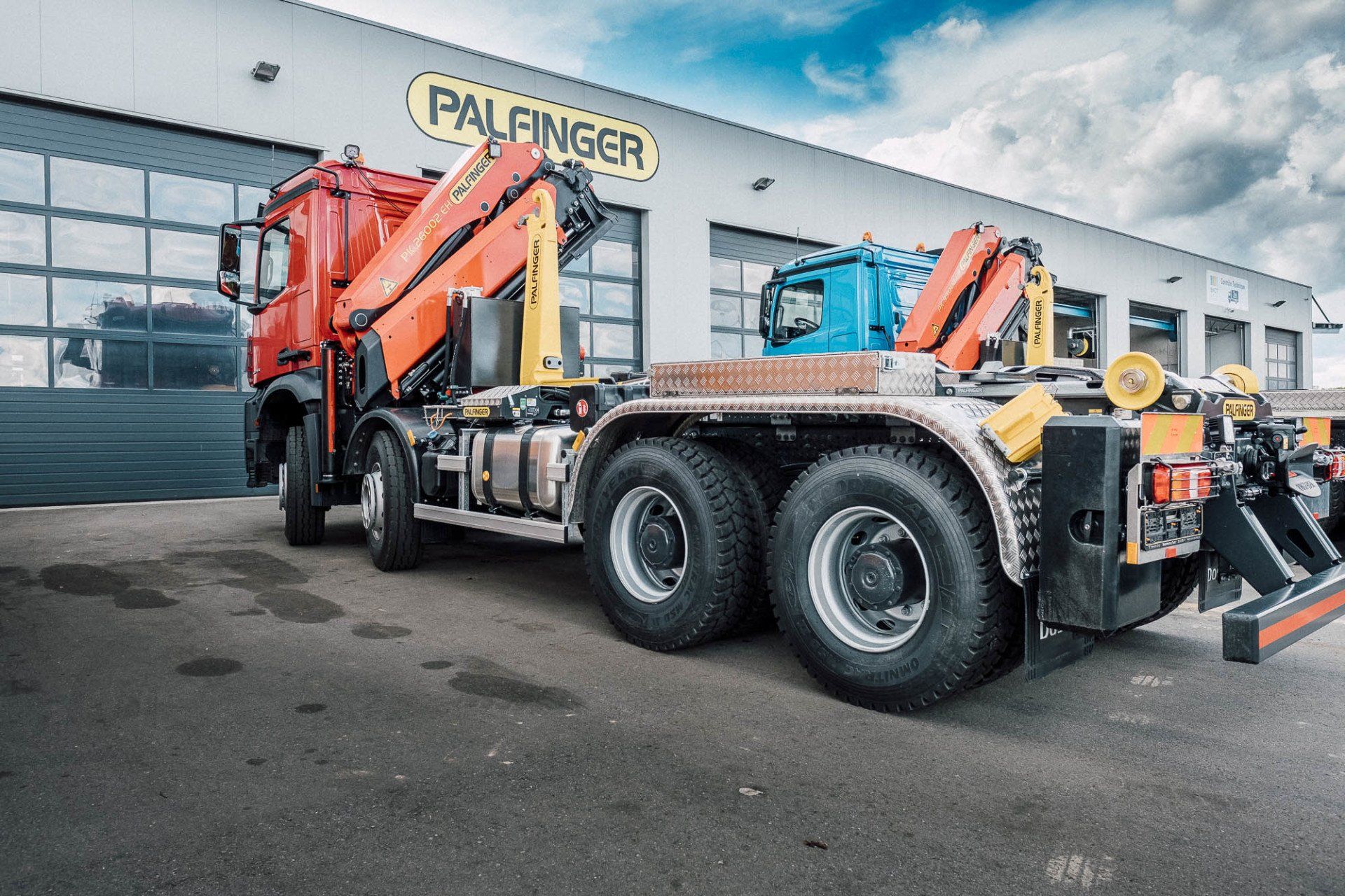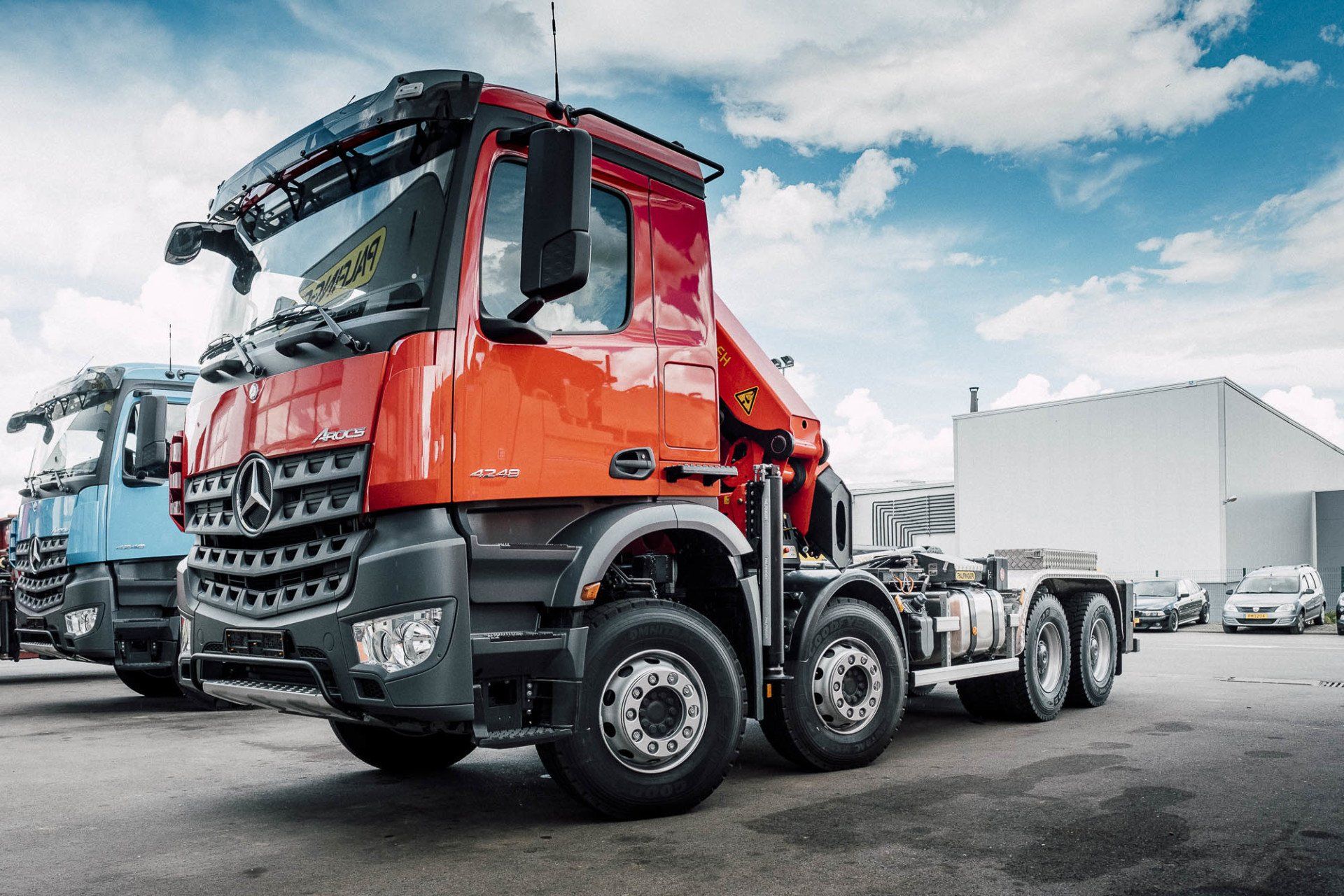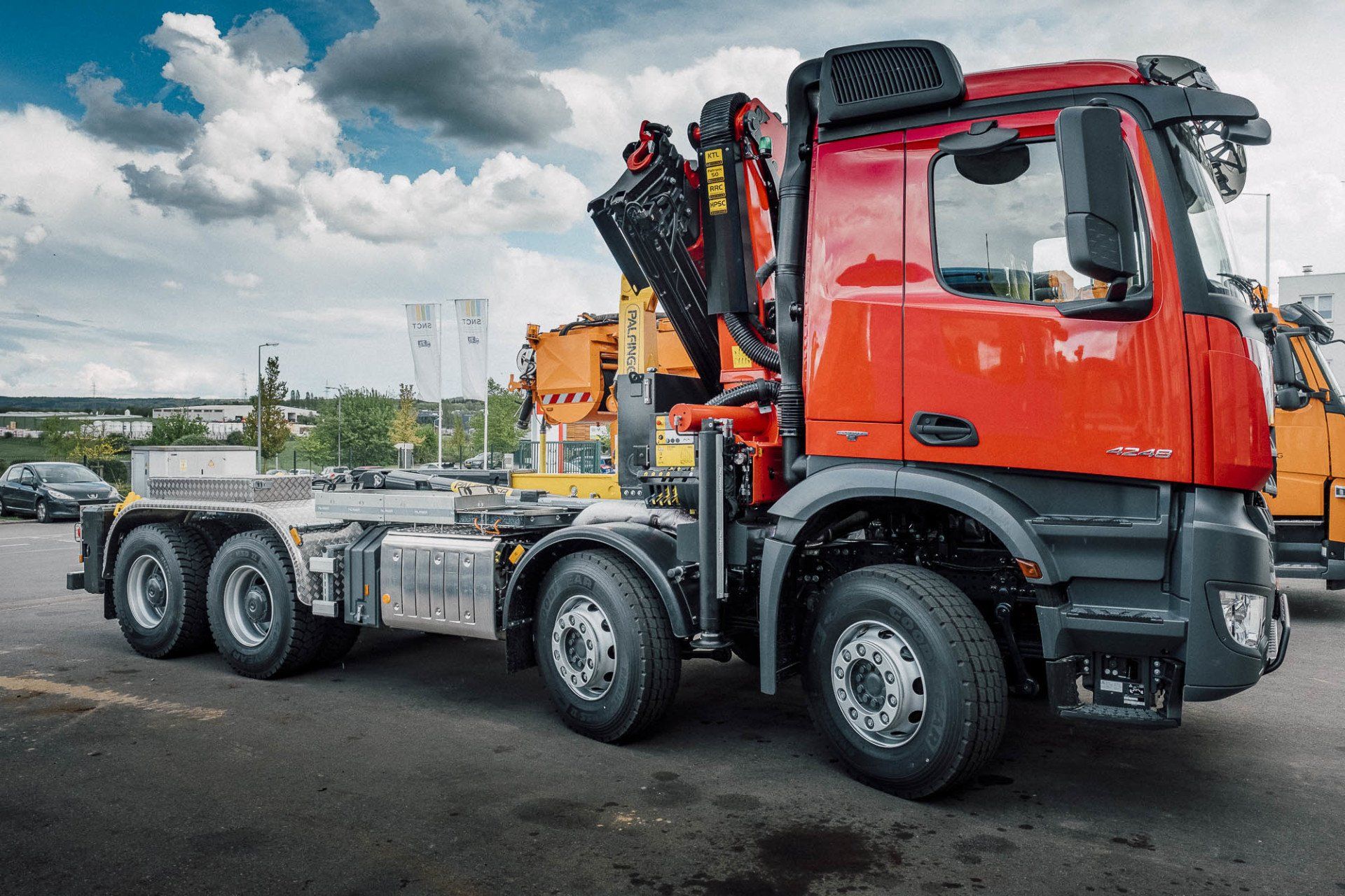 mit einem T22 Abrollkipper, montiert auf einem 4-achs Mercedes-Benz Arocs Fahrgestell